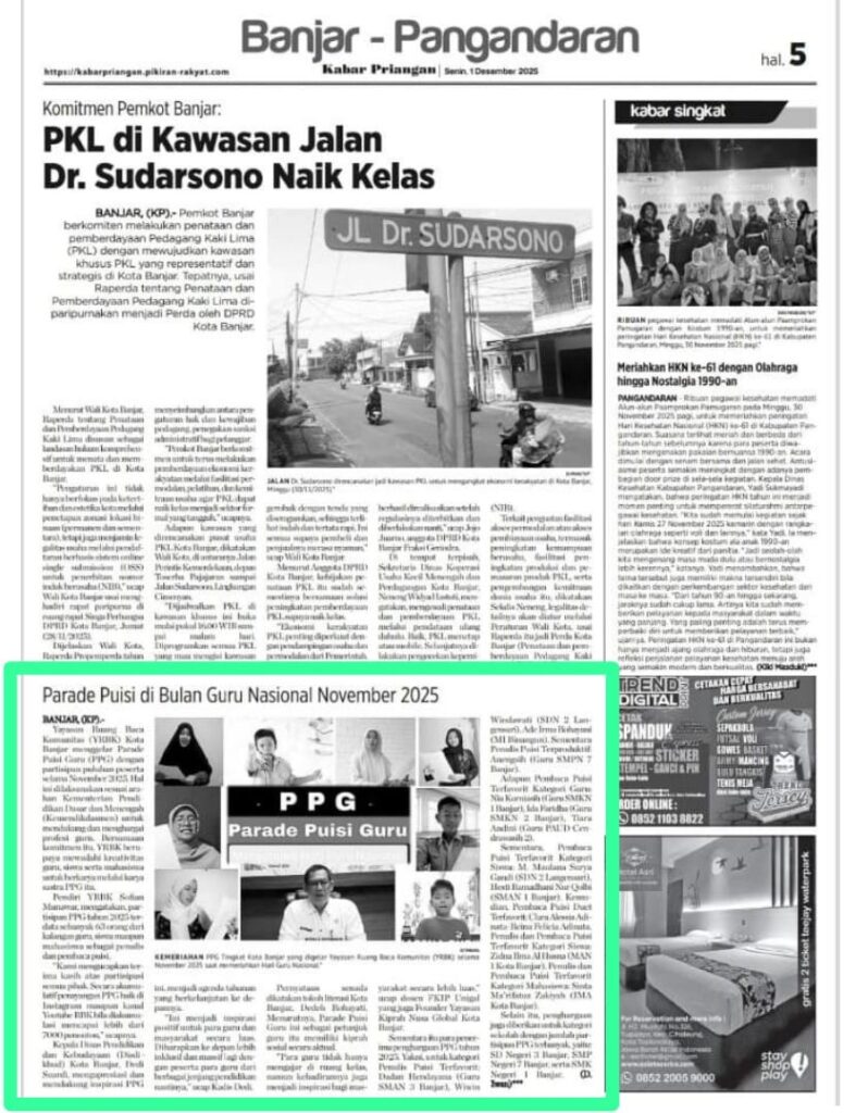 Dalam semangat itulah, Yayasan Ruang Baca Komunitas (YRBK) Kota Banjar turut mengkhidmati “Bulan Guru Nasional” dengan menggelar Parade Puisi Guru (PPG) sepanjang bulan November, guna mewadahi kreativitas guru-guru dan juga siswa serta mahasiswa dalam berkarya, terutama melalaui karya sastra, yakni melalui kegiatan Parade Puisi Guru (PPG) 2025. Kreasi para partisipan PPG ini diharapkan dapat menjadi inspirasi bagi masyarakat lus. Berikut dapat disimak dokumentasi kegiatannya yang dihimpun dari berbagai sumber.