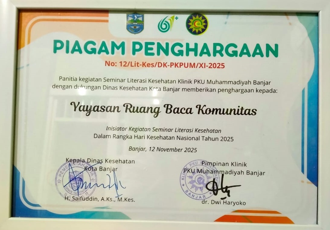 Kesehatan merupakan salah satu isu penting dalam kehidupan manusia. Literasi Kesehatan karenanya menjadi hal fundamental untuk dikaji secara serius. Dengan memanfaatkan momentum Hari Kesehaan Nasional (HKN), Yayasan Ruang Baca Komunitas (YRBK) bersama Dinas Kesehatan Kota Banjar, Klinik PKU Muhammadiyah, STIT Muhammadiyah dan sejumlah pihak lainnya terutama dari komunitas sekolah di Kota Banjar menggelar Seminar Literasi Kesehatan.
